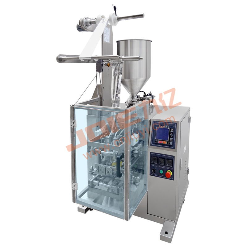 液体包装机适用酱油、醋、牛奶等液体,其成型、制袋、定量灌装、油墨印字、封口切断等过程全部自动进行,薄膜在包装前进行紫外线消毒,符合食品卫生的要求。